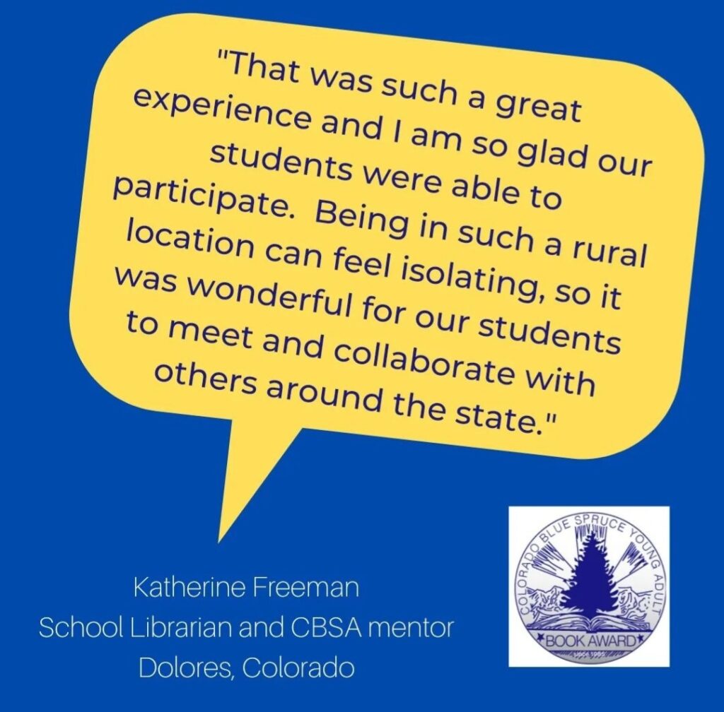 The CBSA is a very permissive framework. The goal is for student judges to read and discuss (at least) three eligible books during the space of the school year, submit a book talk on their favorite book by mid-January and attend two remote statewide meetings. Some teams meet every week, some, every other week and some once a month. If mentors are able to hand over the organization and communication of the book group to their student judges, their time commitment, in addition to reading their team’s chosen books, should be limited to accessing books and book team’s meetings. Not every team can attend the CO Teen Lit Conference in April, but those who can, will be so glad that they did.