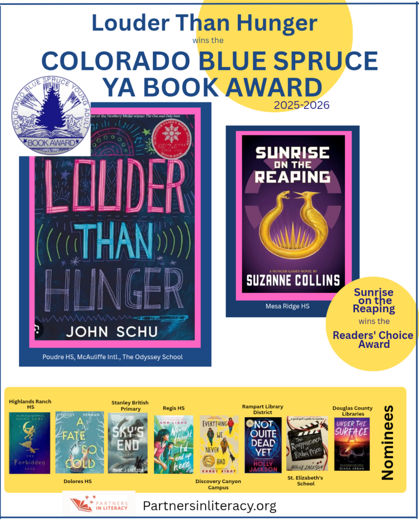 LOUDER THAN HUNGER by John Schu wins the Colorado Blue Spruce Young Adult Book Award 2025-2026.