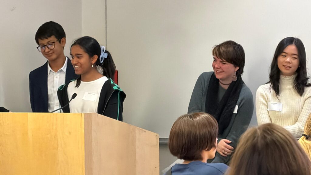 13 students, 6 mentors announcing the award.